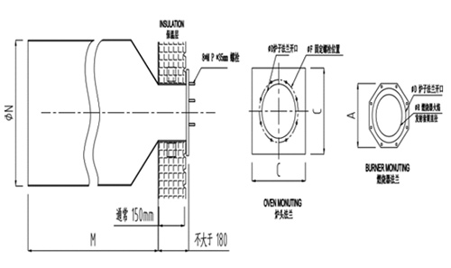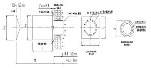 型号 | 炉子法兰 | 炉子法兰开孔 | 固定螺栓位置 | 固定螺栓直径 | 保护套筒直径 | 保护套筒长度 | 分焰锥距离 | 分焰锥直径 | 发射套筒直径 | 燃烧器法兰 |