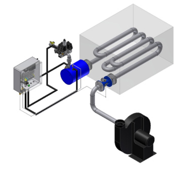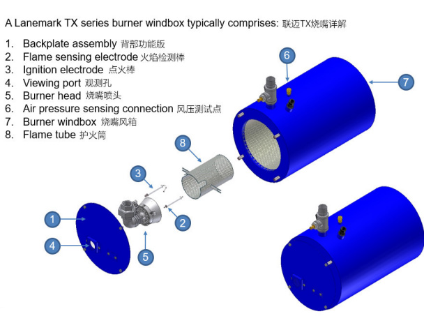 适合于各种液槽加热工业环境的TX燃烧器;符合美国NFPA及欧洲EN746安全标准的双关断阀管路系统;迷你型燃烧控制柜(不含温控温限)或中型燃烧控制系统(含温控温限);烟气出口调节阀;助燃引风机
